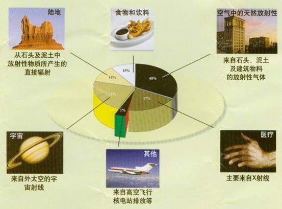 人們受到的放射性照射大約有82%來自天然環(huán)境,大約有17%來自醫(yī)療診斷,而來自其他活動(dòng)大約只有1%。